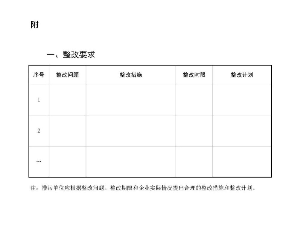 ?。ǘ└郊?。內(nèi)容包括排污限期整改要求,列明整改問題、整改內(nèi)容、整改時(shí)限等,提出整改期限內(nèi)污染物排放要求,列明各排污口污染物排放法定執(zhí)行標(biāo)準(zhǔn)限值和自行監(jiān)測(cè)要求等。