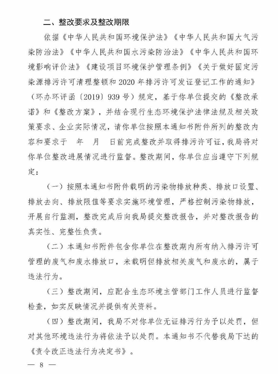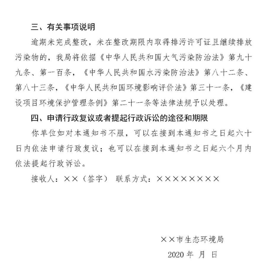 (一)正文。內(nèi)容包括排污單位名稱、法定代表人或者主要負(fù)責(zé)人、生產(chǎn)經(jīng)營場(chǎng)所所在地、統(tǒng)一社會(huì)信用代碼等企業(yè)基本信息,載明整改問題類型和整改時(shí)限,告知排污單位整改要求和逾期未完成整改的法律后果。